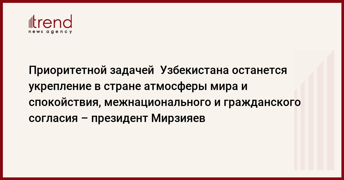 ТАШКЕНТ /Trend/ - Нашей приоритетной задачей и впредь останется укрепление в стране атмосферы мира и спокойствия, межнационального и гражданского согласия, сказал президент Узбекистана Шавкат Мирзиеев в новогоднем обращении к гражданам страны.