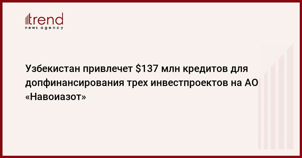 ТАШКЕНТ /Trend/ - Узбекистан планирует дополнительно привлечь в зарубежных банках кредиты на общую сумму 137,36 миллиона долларов под гарантию правительства для финансирования трех инвестиционных проектов на АО "Навоиазот", крупнейшем в республике химическом предприятии по производству минеральных удобрений, следует из обнародованного в СМИ постановления президента Шавката Мирзияева.