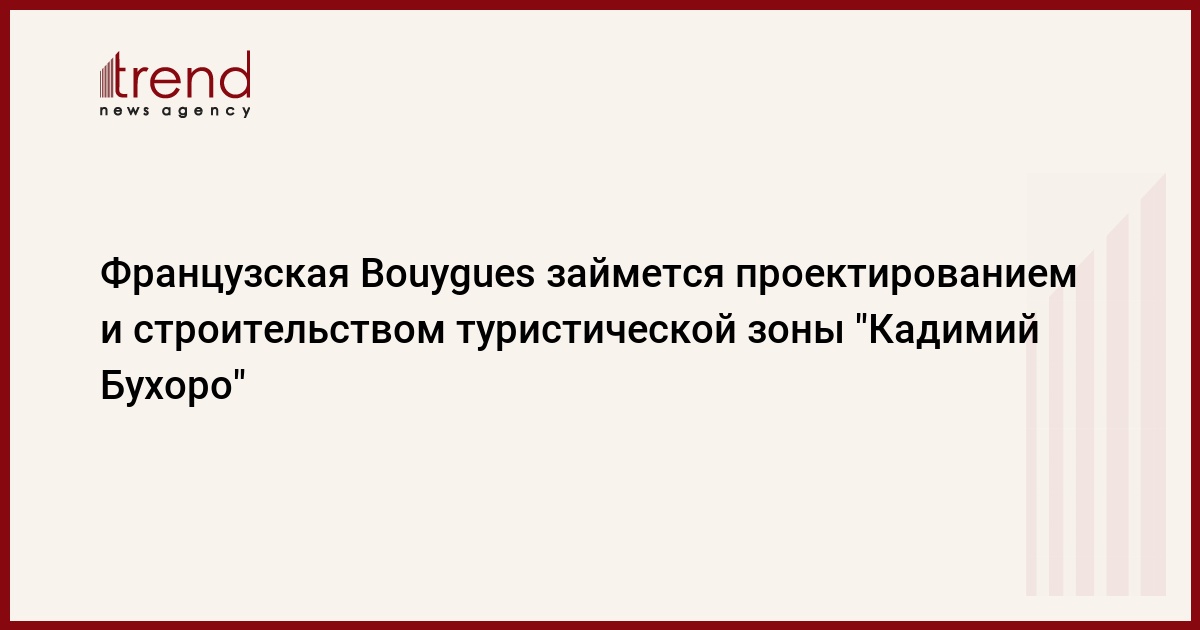 БАКУ /Trend/ - Национальный банк Узбекистана (НБУ) и французская компания Bouygues Batiment International SAS подписали соглашение о сотрудничестве в реализации проектов в туристической отрасли на 100 миллионов евро, сообщает Podrobno.uz.
