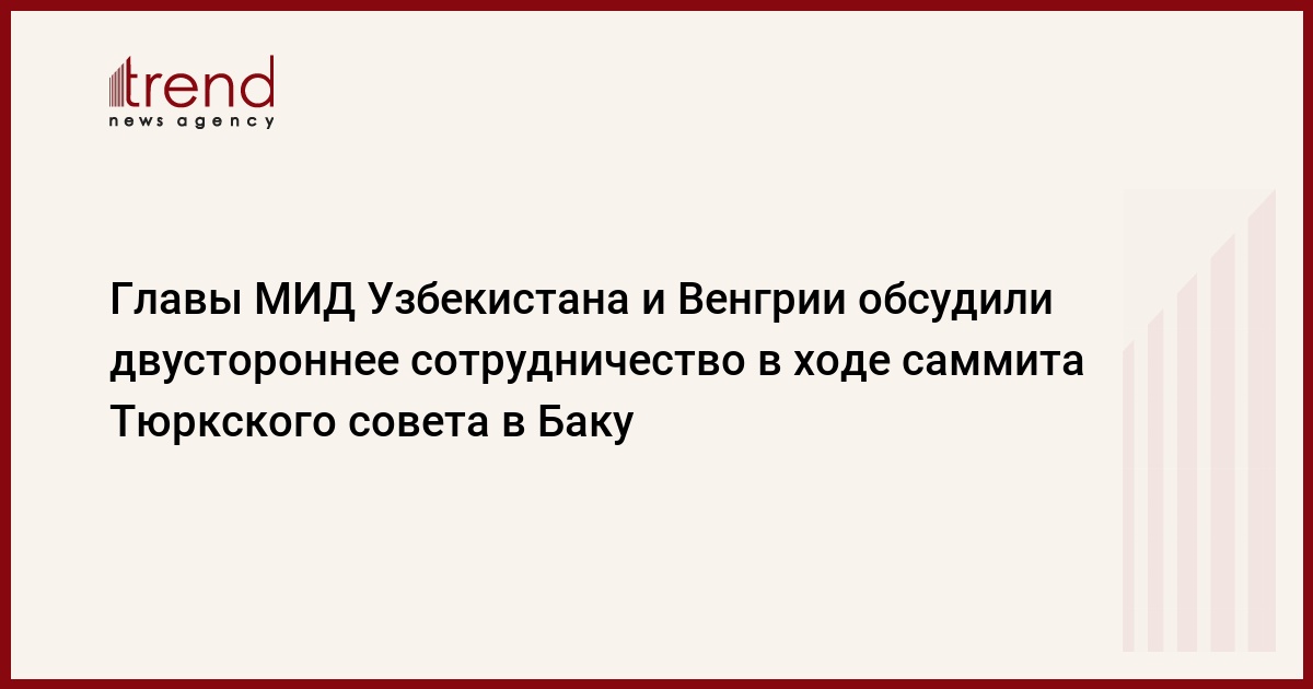 БАКУ /Trend/ - Министр иностранных дел Узбекистана Абдулазиз Камилов в понедельник встретился с Петером Сийарто, министром внешних экономических связей и иностранных дел Венгрии – страны-наблюдателя в Совете сотрудничества тюркоязычных государств (Тюркский совет), сообщает Trend со ссылкой на МИД Узбекистана.