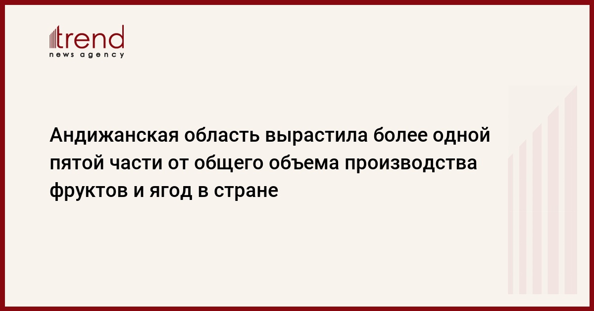 Андижанская область Узбекистана стала лидером по выращиванию фруктов и ягод в стране, производя свыше одной пятой части от общего объема их производства, сообщает Trend со ссылкой на Дунё.