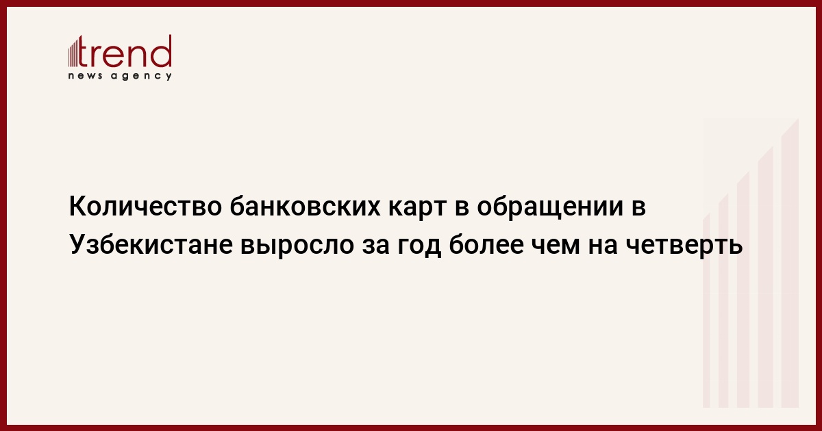 БАКУ /Trend/ - В январе – июне 2022 года количество банковских карт в обращении в Узбекистане выросло на 26,2 процента по сравнению с аналогичным периодом прошлого года (23,7 миллиона) и составило 29,9 миллиона, передает в среду Trend со ссылкой на узбекский Центробанк.