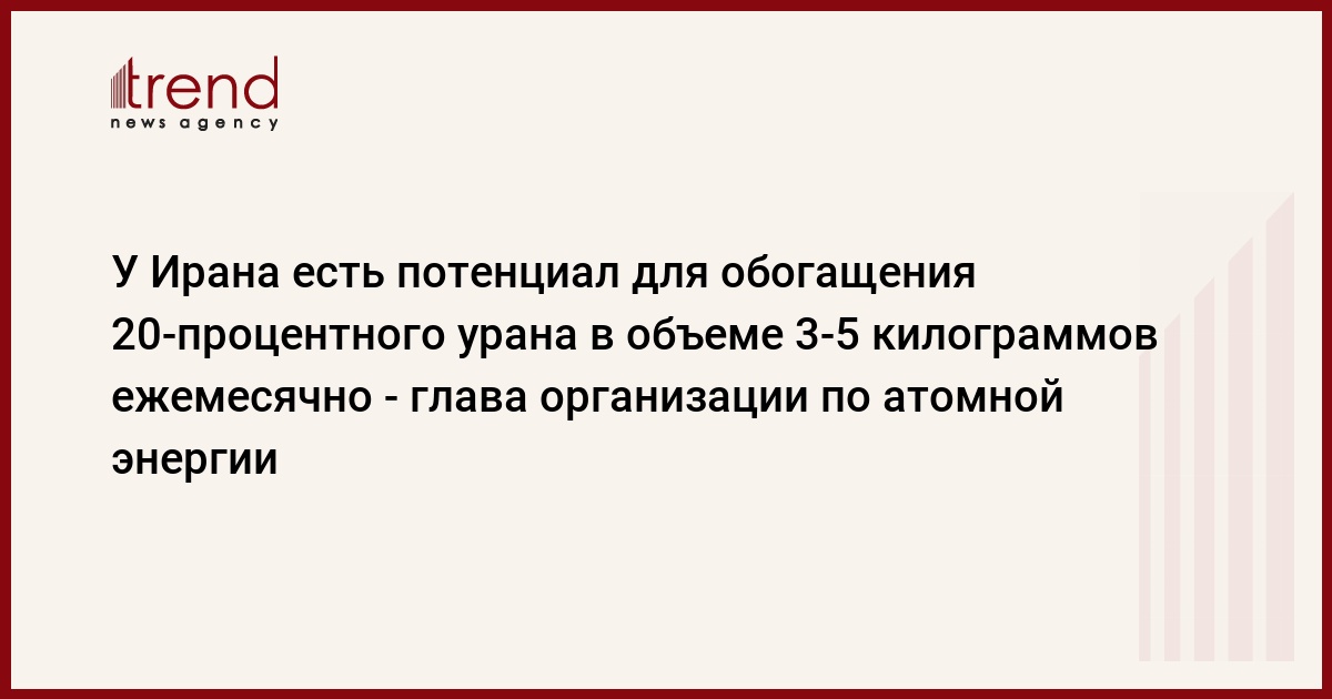 У Ирана есть потенциал для обогащения 20-процентного урана в объеме 3-5 килограммов ежемесячно - глава организации по атомной энергии