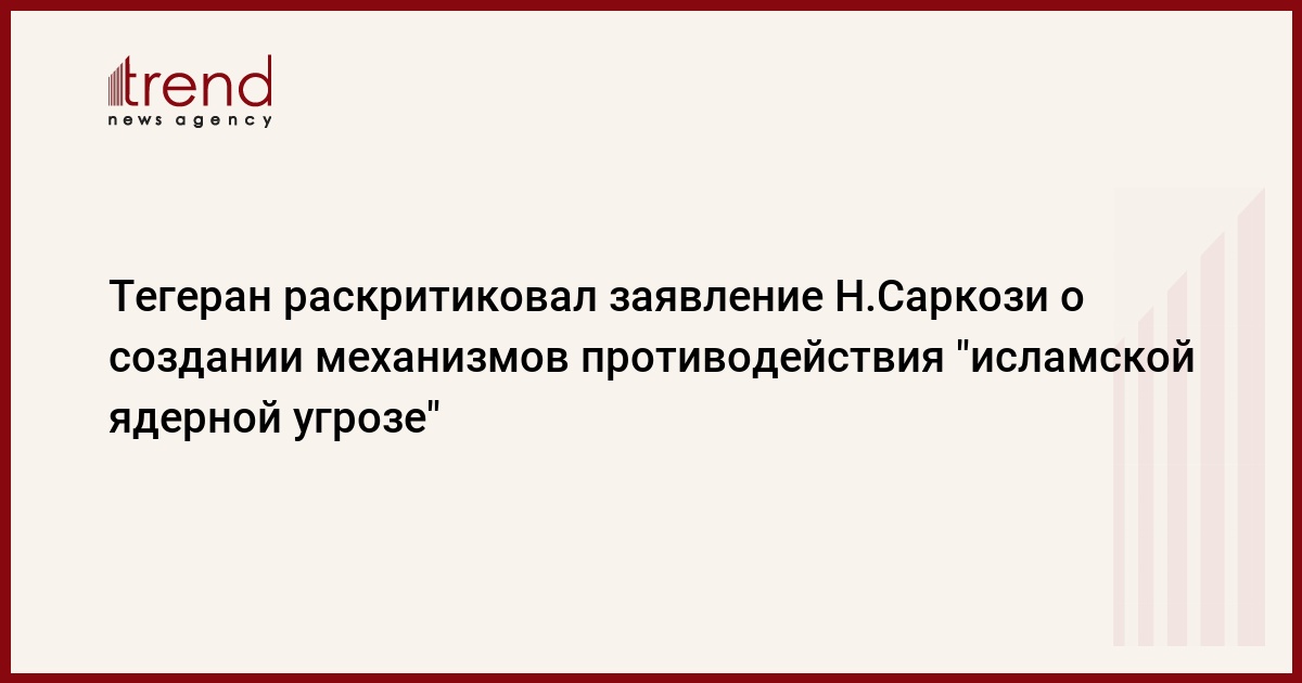 Тегеран подверг критике заявление президента Франции Николя Саркози о необходимости создания механизмов противодействия и защиты от исламских стран, обладающих ядерным оружием. Пресс-секретарь иранского Министерства иностранных дел Мохаммад Али Хоссейни заявил, что Иран является источником мира и стабильности на Ближнем Востоке. "Проведение параллелей между недавно достигнутым развитием мощностей Ирана и возможными угрозами по отношению к другим странам является неуместным и некорректным ", - цитирует Reuters представителя иранского МИД.