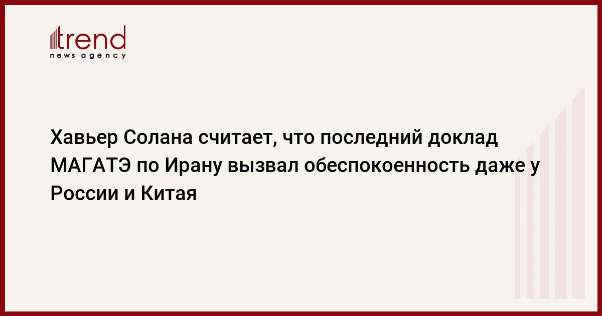 Верховный представитель ЕС по вопросам внешней политики и безопасности Хавьер Солана выразил мнение, что даже у России и Китая появилась обеспокоенность в связи с последним докладом Международного агентства по атомной энергии (МАГАТЭ) по Ирану, согласно которому Тегеран препятствует попыткам проверить достоверность обвинений в проведении исследований и экспериментов, направленных на создание атомного оружия, передает РБК со ссылкой на Associated Press. Х.Солана также заявил, что доклад МАГАТЭ не принесет ничего хорошего Ирану. Кроме того, верховный представитель ЕС по вопросам внешней политики и безопасности отметил, что у французской инициативы по введению новых санкций против Ирана есть сторонники, и Совет Безопасности ООН намерен тщательно проанализировать сложившуюся ситуацию.