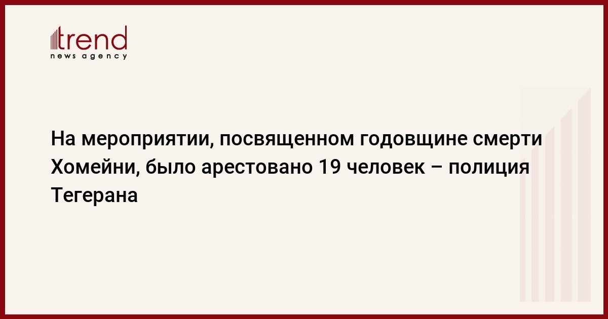 Вчера на мероприятии, посвященном 21-й годовщине со дня смерти лидера Исламской революции в Иране Рухолла Мусави Хомейни, было арестовано 19 человек. Об этом сказал командир полиции Тегерана Гусейн Саджидиниа, передает иранское информационное агентство ISNA.