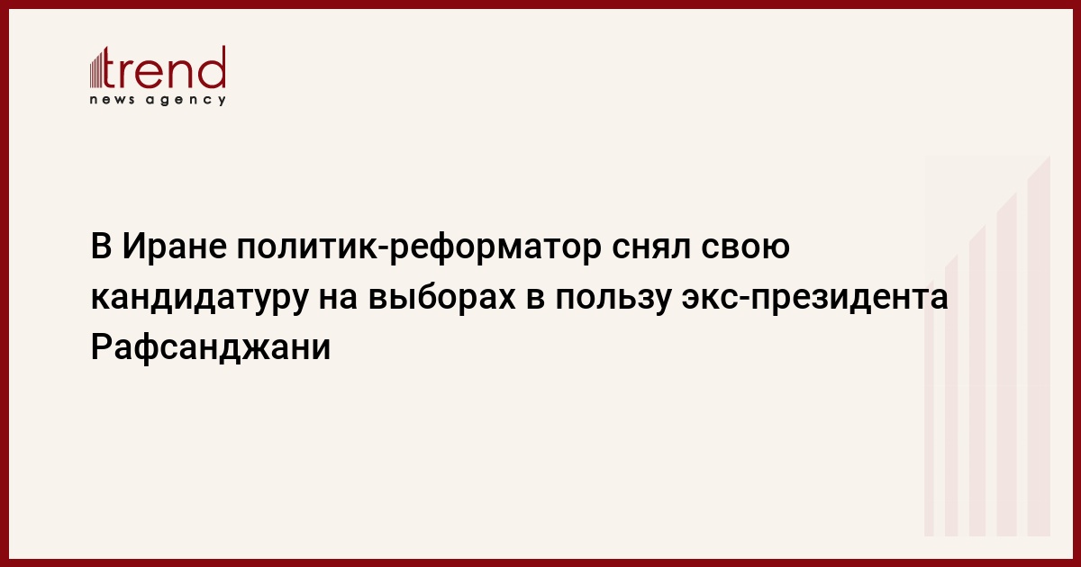 Политик-реформатор, кандидат в президенты Ирана Мохаммад Шариатмадари снял свою кандидатуру с предстоящих президентских выборов в пользу бывшего президента страны Али Акбара Хашеми Рафсанджани, сообщает в четверг агентство Tasnim.