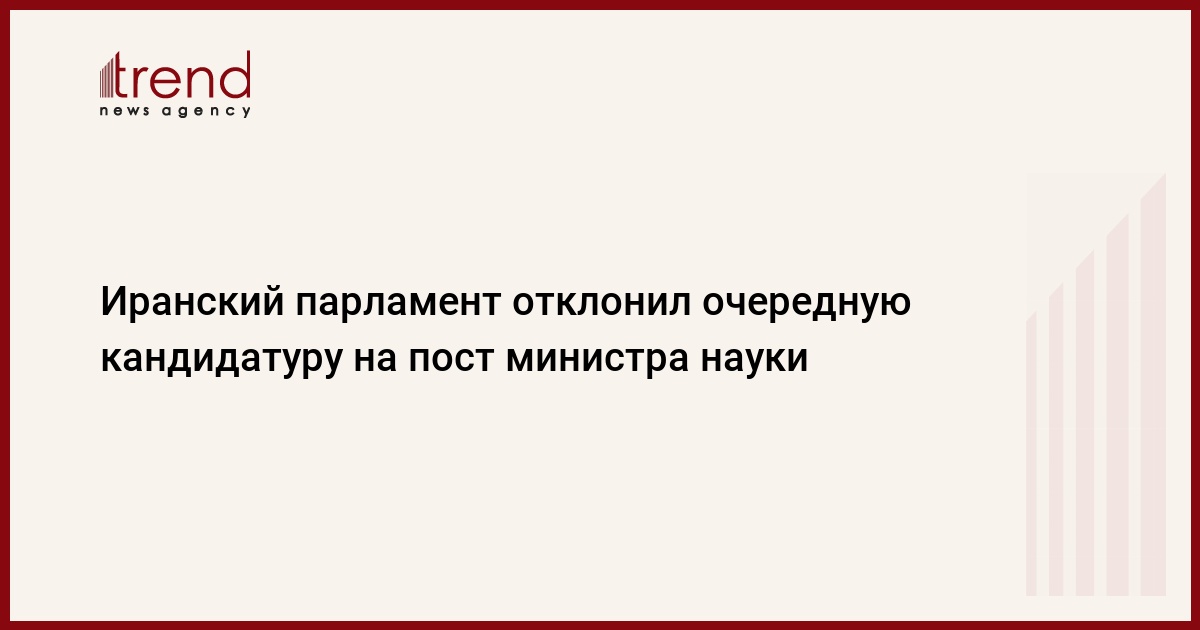 БАКУ /Trend/ - Иранский парламент отклонил кандидатуру Фахратдина Ахмади Данеш Аштиани, выдвинутую президентом страны Хасаном Рухани на пост министра науки, исследований и технологий, сообщило во вторник иранское государственное телевидение IRINN.