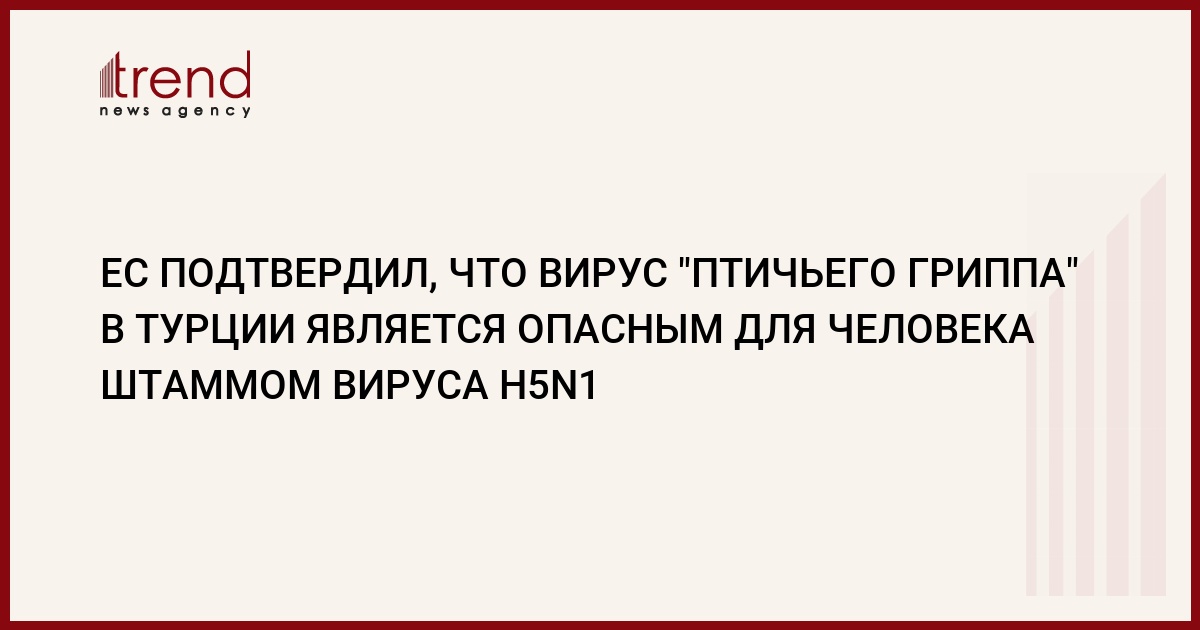 (АР) Европейский союз (ЕС) подтвердил, что обнаруженный в Турции вирус "птичьего гриппа" является смертельно опасным для человека штаммом вируса H5N1. По словам еврокомиссара по вопросам здравоохранения Маркуса Куприану,происхождение обнаруженного в Турции вируса напрямую связано с вирусом,зафиксированным ранее в России, Монголии и Китае. М.Куприану также рекомендовал проведение сезонной вакцинации жителей в качестве меры,направленной на предотвращение эпидемии "птичьего гриппа" среди людей.