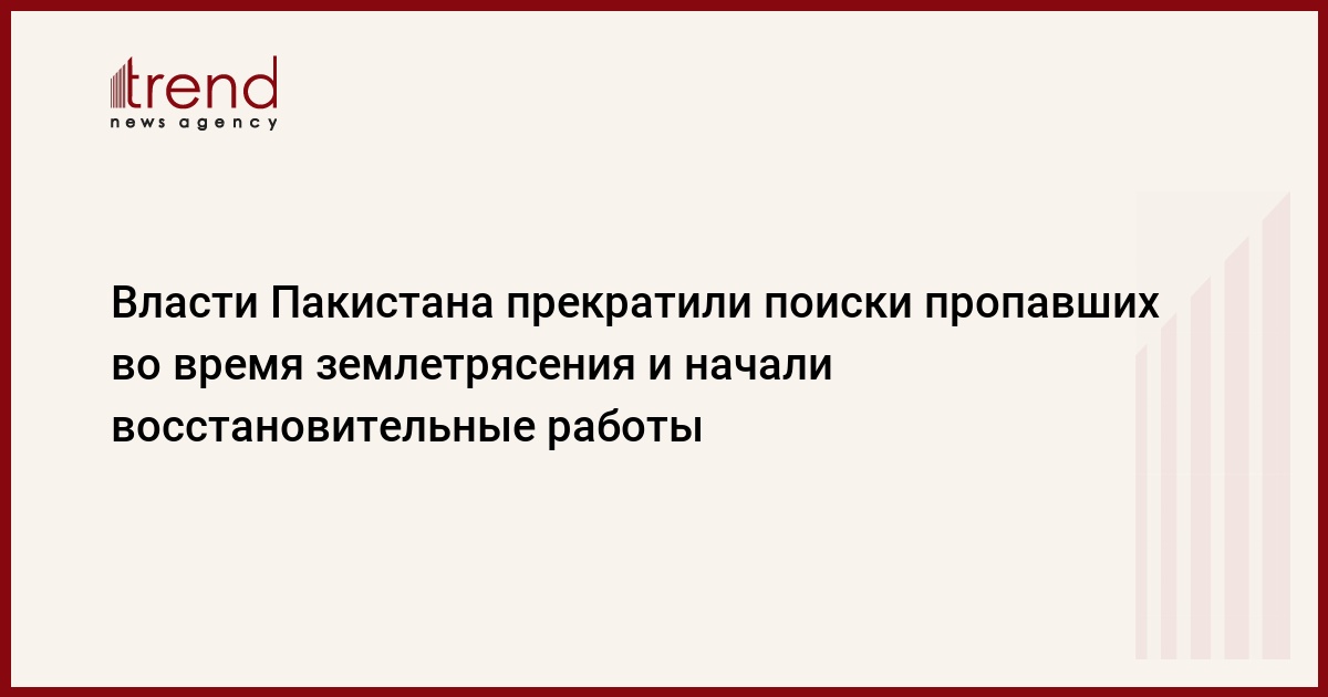 (AP) Сегодня власти Пакистана прекратили поиски живых людей, оказавшихся под завалами в результате землетрясения 8 октября с.г. Hа седьмой день после стихийного бедствия власти страны приняли решение сконцентрировать усилия на извлечении тел погибших, а также на восстановлении сильно поврежденных районов.