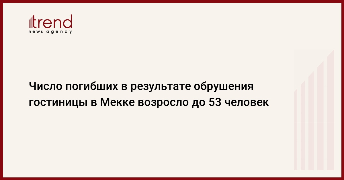 Число погибших в результате обрушения гостиницы в Мекке возросло до 53 человек. Как передает Trend , еще 59 человек получили ранения в результате инцидента, причем 24 из них были госпитализированы. Большинство погибших и пострадавших - паломники, прибывшие в Саудовскую Аравию для совершения хаджа.