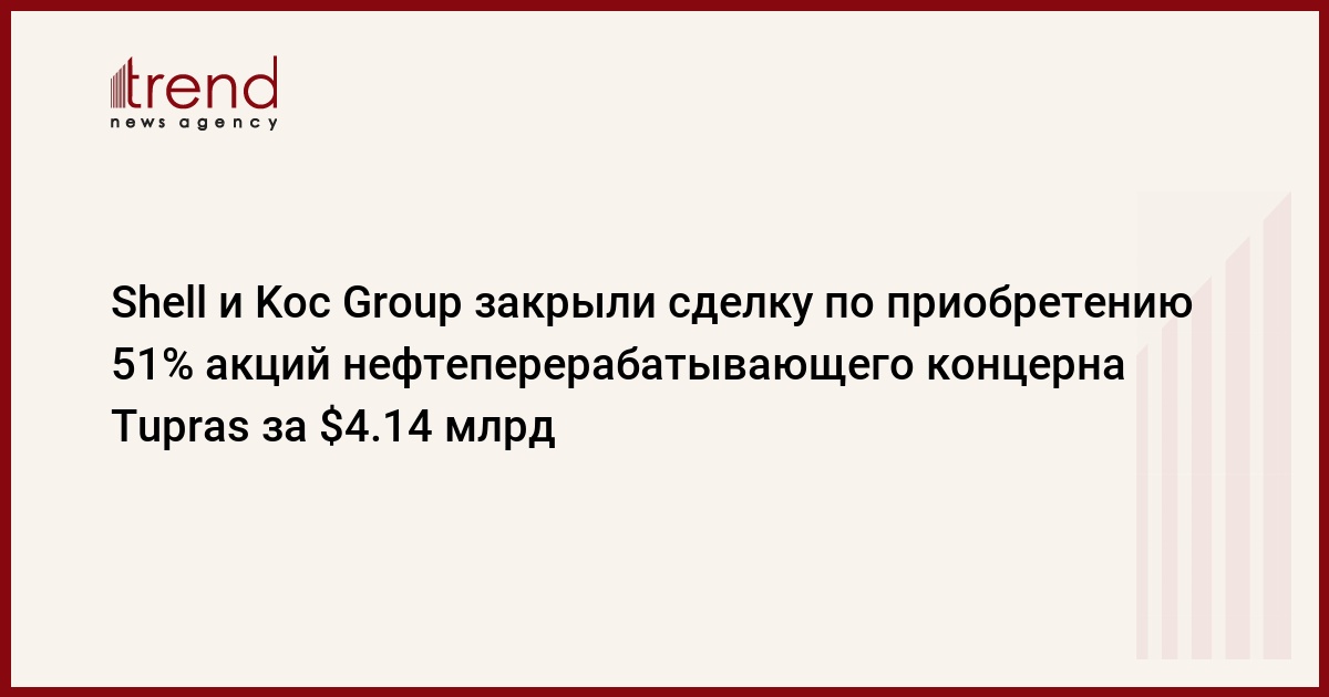 Shell и Koc Group вчера закрыли сделку по приобретению 51% акций турецкого нефтеперерабатывающего концерна Tupras. Как передает Trend , об этом говорится в сообщении концерна.