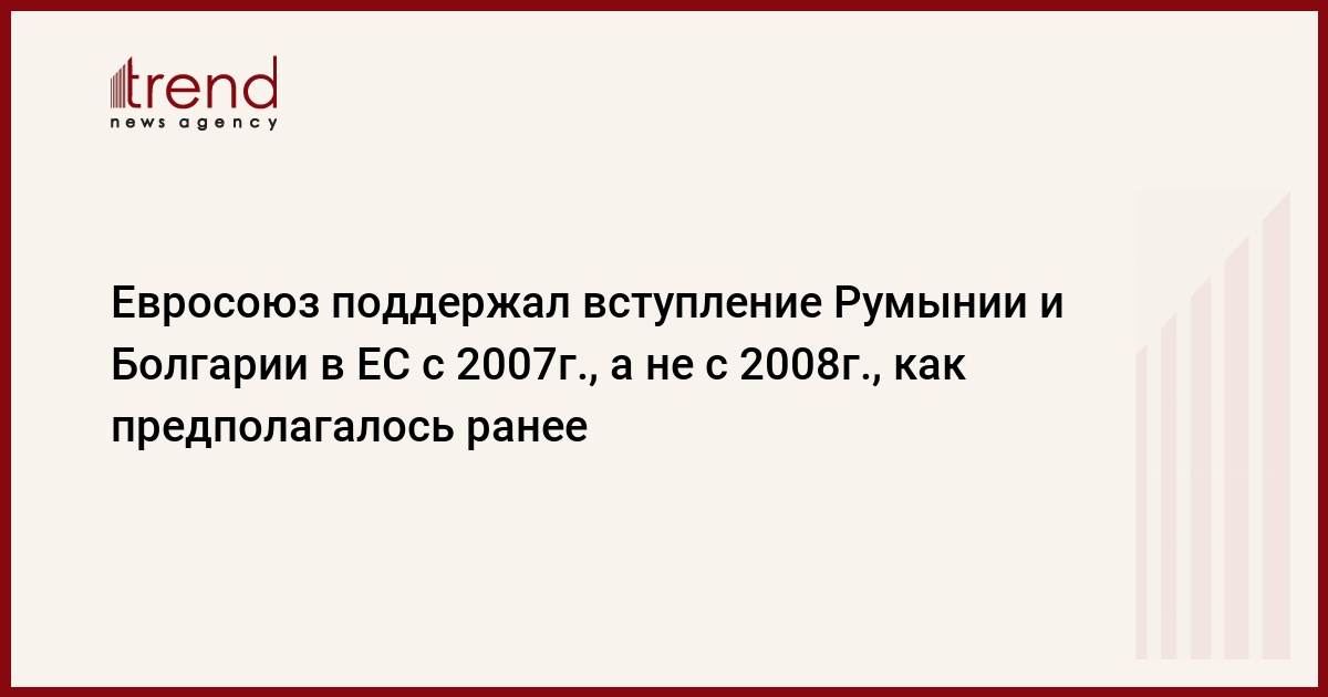 Министры иностранных дел стран Евросоюза формально одобрили 17 октября вступление Румынии и Болгарии в ЕС с января 2007г., а не с 2008г., как было решено ранее. Как передает (С) Reuters (Click for restrictions), таким образом число стран - членов ЕС вырастет до 27. "Совет приветствует вступление Болгарии и Румынии в Европейский союз с 1 января 2007г.", - говорится в заявлении, принятом на ежемесячном совещании министров.