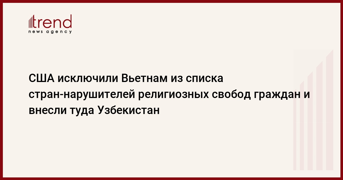 Как передает Trend со ссылкой на РБК, по мнению американских властей, за последний год Вьетнам предпринял ряд значительных шагов в сторону улучшения положения дел в этой области. Из тюрем, в частности, были отпущены заключенные, осужденные за исповедание той или иной религии, а также приняты законы, запрещающие преследование верующих, которых в свое время вынудили отречься от веры.