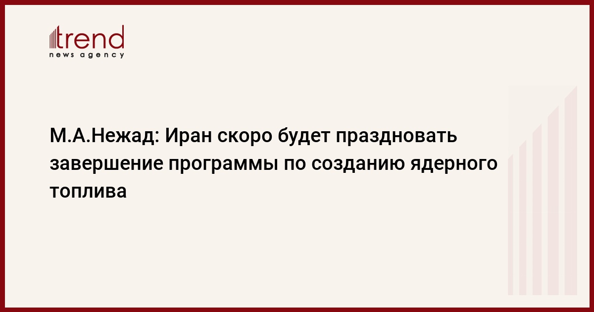 Иран скоро будет праздновать завершение программы по созданию ядерного топлива. Такое заявление сегодня сделал президент страны Махмуд Ахмади Нежад. "Благодаря мудрости и стойкости иранского народа наша позиция стабилизировалась, и я очень надеюсь, что мы сможем отпраздновать завершение программы по созданию ядерного топлива уже в этом году", - заявил М.А.Нежад. Иранский год заканчивается 20 марта 2007г., передает (C) Associated Press.