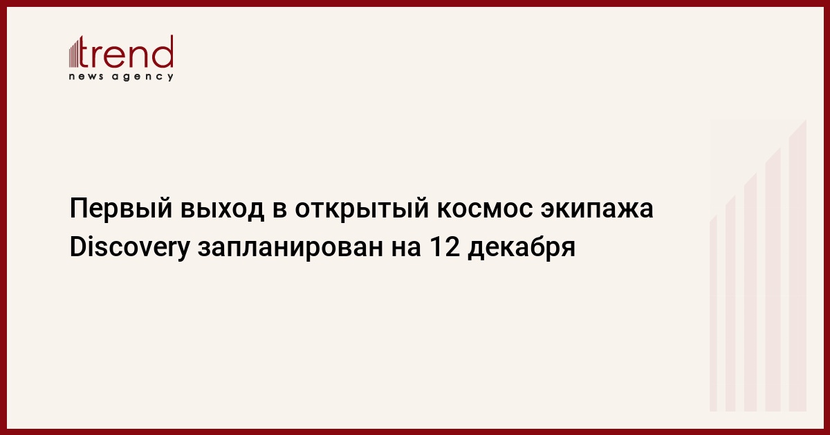 Первый выход в открытый космос экипажа корабля многоразового использования Discovery системы space shuttle запланирован на 23:12 мск 12 декабря 2006г., сообщается в материалах NASA. Второй выход в открытый космос астронавтов NASA запланирован на 23:12 мск 14 декабря, третий - на 22:37 мск 16 декабря. Длительность работ в открытом космосе в каждый из выходов составит примерно 6 часов 10 минут.