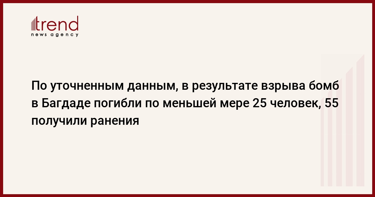 По уточненным данным, в результате трех одновременных взрывов, произошедших сегодня в иракской столице - г. Багдаде, погибли по меньшей мере 25 человек, 55 получили ранения, сообщает (C) Associated Press со ссылкой на источники в больнице, куда были направлены раненые.