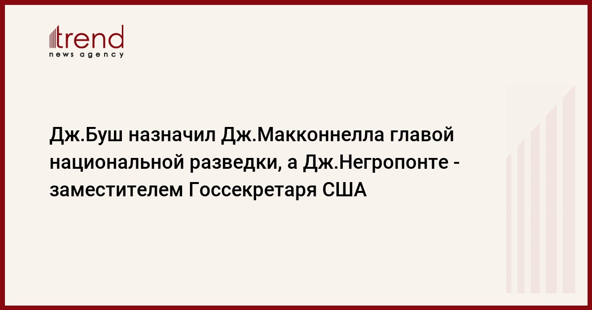 Президент США Джордж Буш назначил вице-адмирала ВМФ Джона МакКоннелла главой Службы национальной разведки США - агентства, координирующего работу всех 16 американских спецслужб, а Джона Негропонте, занимавшего этот пост с 2005г., - на пост заместителя Госсекретаря США, сообщает (с) Reuters.