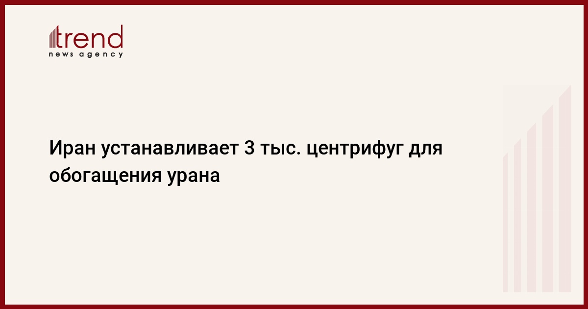 Иран устанавливает 3 тыс. центрифуг для обогащения урана, заявил глава парламентского комитета по иностранным делам и национальной безопасности страны Алаэддин Боружерди. "Мы начали установку 3 тыс. центрифуг", - передает (с) Reuters слова А.Боружерди.