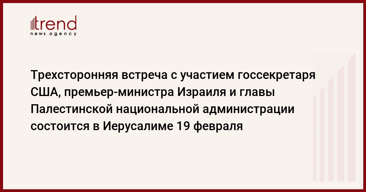 Трехсторонняя встреча с участием госсекретаря США Кондолизы Райс, премьер-министра Израиля Эхуда Ольмерта и главы Палестинской национальной администрации Махмуда Аббаса состоится в Иерусалиме 19 февраля 2007г. Об этом объявил сегодня глава израильского правительства, передает (с) Reuters.