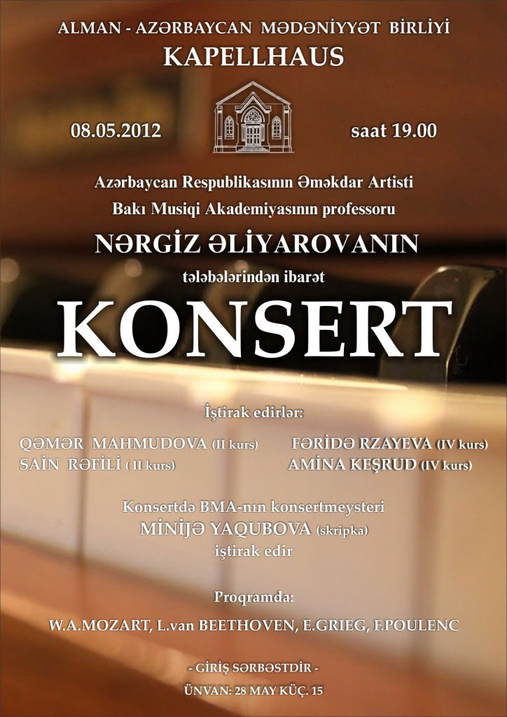 В Баку в немецко-азербайджанском центре культуры "Капелльхаус" 8 мая состоится концерт студентов заслуженной артистки Азербайджана, профессора Бакинской музыкальной академии Наргиз Алияровой.