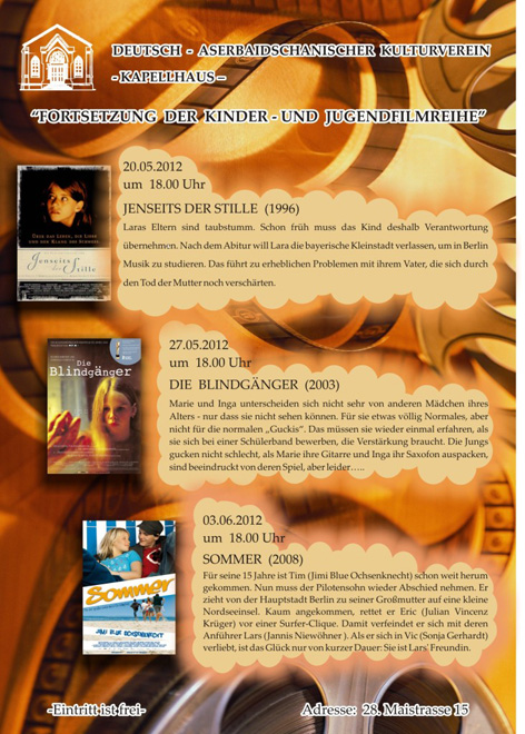 Как передает Trend Life, 20 мая будет показан фильм "За гранью тишины" ("Jenseits der Stille"), 27 мая - картина "Нелегал" ("Die Blindgänger"), а 3 июня зрители увидят фильм "Лето" ("Sommer"). Начало показа всех фильмов в 18.00, вход - свободный.