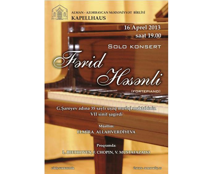 В германо-азербайджанском культурном обществе "Капелльхаус" в Баку 16 апреля состоится соло-концерт Фарида Гасанли (фортепиано), сообщает Trend Life.