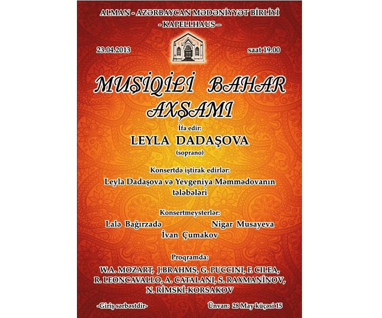 В Баку 23 апреля в германо-азербайджанском культурном обществе "Капелльхаус" состоится концертная программа "Музыкальный вечер весны", сообщает Trend Life.