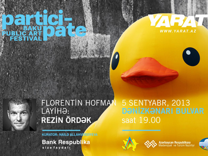 Благодаря Participate Baku Public Art Festival, организованному Пространством Современного Искусства "YARAT"", в августе этого года художник и его творение наконец прибудут в Баку, а пятого сентября 12-метровый "Резиновый Утенок" будет спущен на воды Каспия на бульваре.