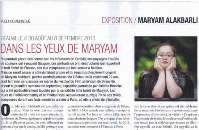 Можно было бы часами говорить о влиянии художника, об этих излучающих цвета пейзажах, которые воскрешают в памяти Гогена, об этих слегка искаженных портретах, которые напоминают о свободной кисти Пикассо, об этой сладострастной наготе, которая напоминает Матисса. Но это означало бы пройти рядом с особенным талантом и глубоко оригинальным взглядом Марьям Алекперли, азербайджанской художницы, родившейся в Баку всего лишь 22 года тому назад, работы которой будут выставлена вне Фестиваля американского фильма в Довиле в течение первой недели сентября на выставке под патронажем Жюльет Бинош, которая была особенно тронута чувственностью и талантом Марьям. Стены отеля "Норманди" и отеля "Рояль" примут около 70-и из ее полотен, созданных в течение этих последних трех лет, проведенных в Париже, который она выбрала для творчества.