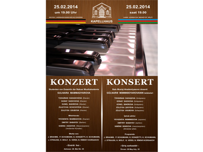 В германо-азербайджанском культурном обществе "Капелльхаус" в Баку 25 февраля состоится концерт с участием студентов доцента Бакинской музыкальной академии Гюльнары Мамедъяровой, сообщили Trend Life в "Капелльхаус".