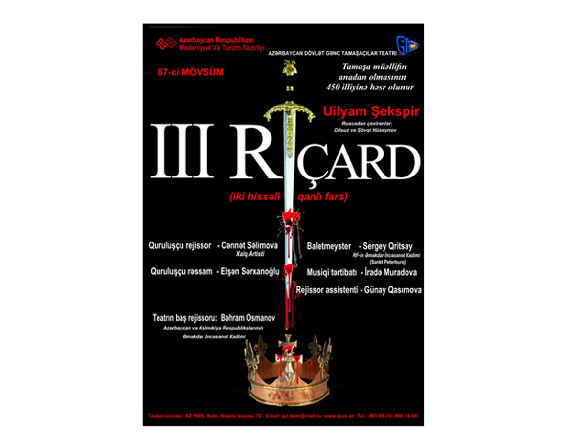 БАКУ /Trend Life/ - В 19:00 25 января на сцене Азербайджанского государственного театра юного зрителя состоится премьера спектакля "Ричард III", сообщили Trend Life в пресс-службе театра.