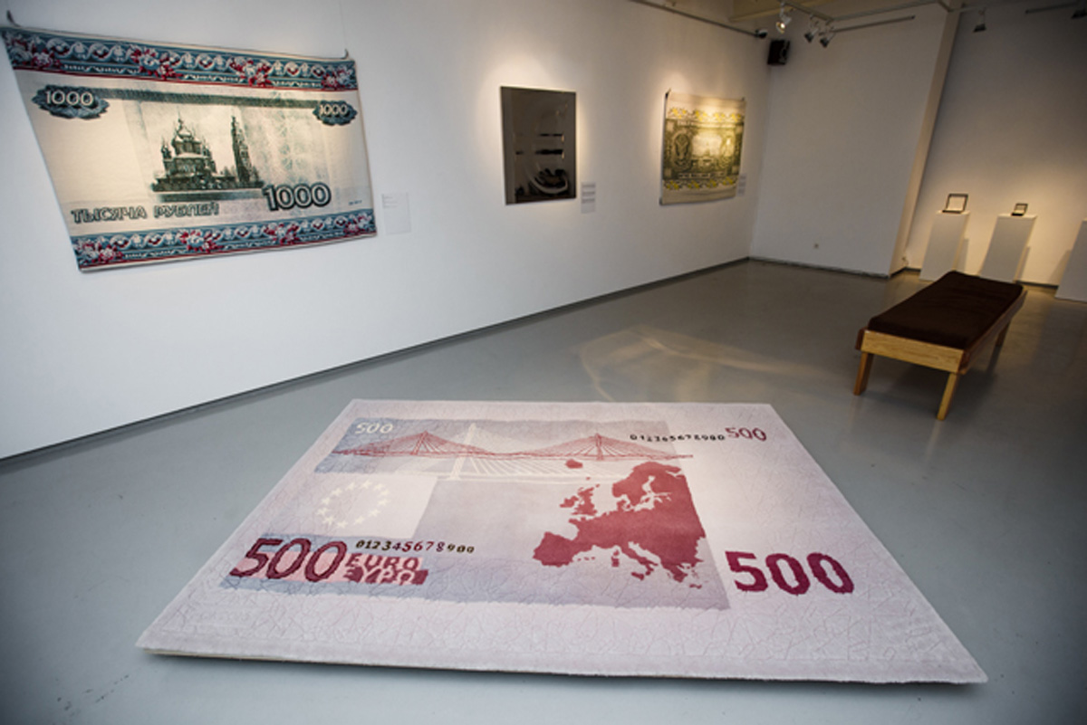Гобелены в виде купюр в тысячу рублей и одного миллиона долларов, зеркало в виде знака евро, ковер в виде пятисотки - все это экспонаты выставки, через которые художница показывает, как глобальный экономический кризис вынуждает искусство думать о деньгах и их этичности.