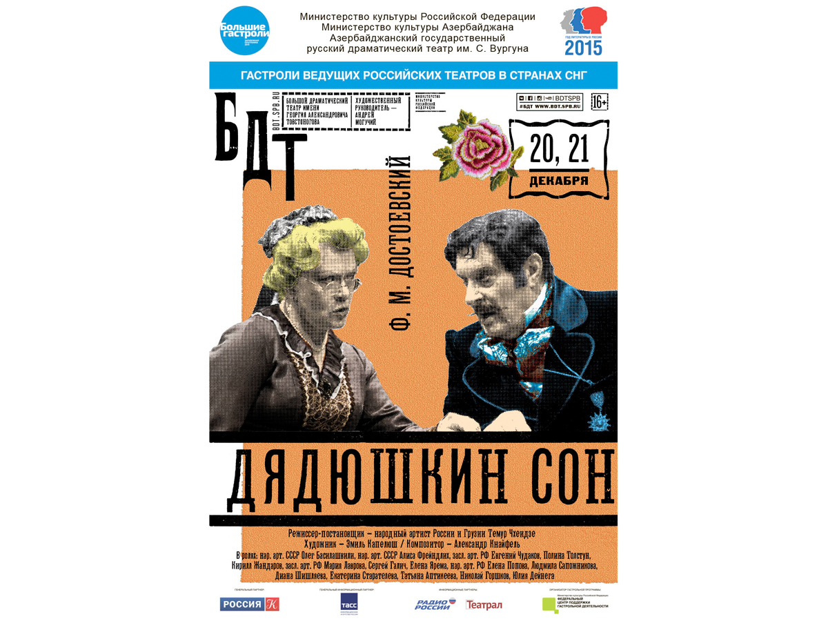 Напомним, что в рамках программы Федерального Центра поддержки гастрольной деятельности "Большие гастроли 2015. Международная программа" министерства культуры Российской Федерации, а также при поддержке министерства культуры и туризма Азербайджана, 20 и 21 декабря на сцене Русского драматического театра имени Самеда Вургуна пройдут гастроли Большого драматического театра им. Г.А. Товстоногова со спектаклем "Дядюшкин сон".