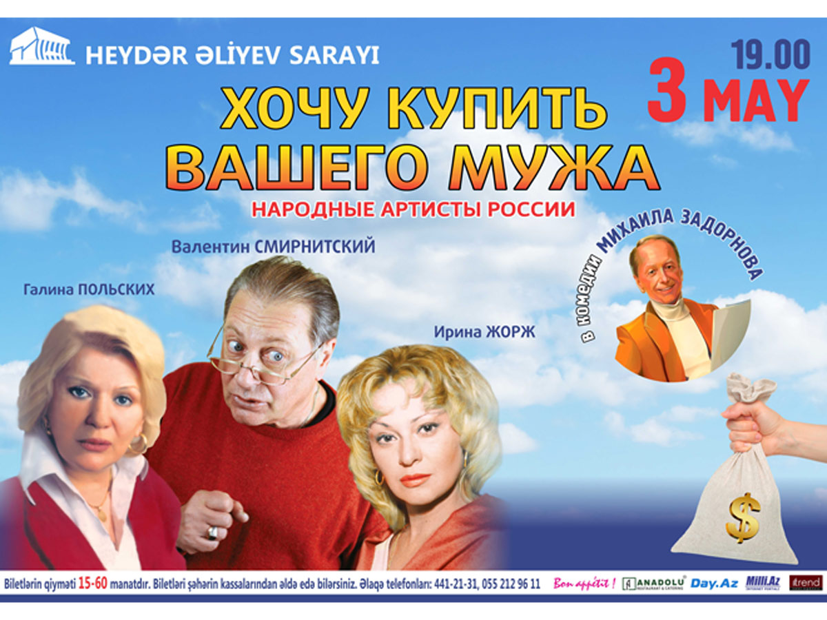 БАКУ /Trend Life/ - Во Дворце Гейдара Алиева в Баку в 19:00 3 мая покажут спектакль Московского театра "О'Кей" "Хочу купить вашего мужа" с участием известных российских актеров, сообщили Trend Life в пресс-службе дворца.