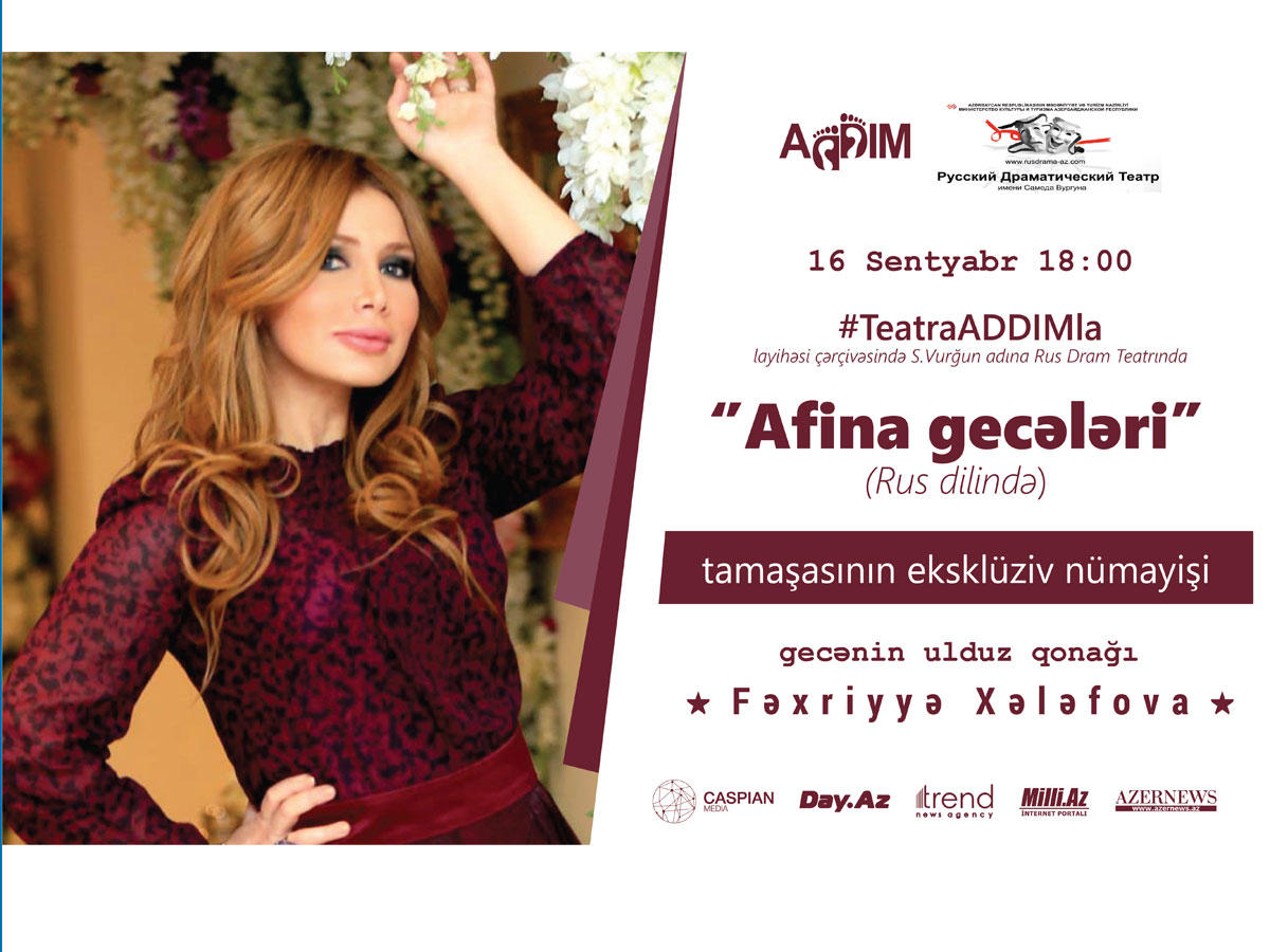 16 сентября в 18.00 вместе с группой молодежи Фахрия Халафова посетит спектакль "Афинские вечера", который будет представлен на сцене Государственного русского драматического театра имени Самеда Вургуна.