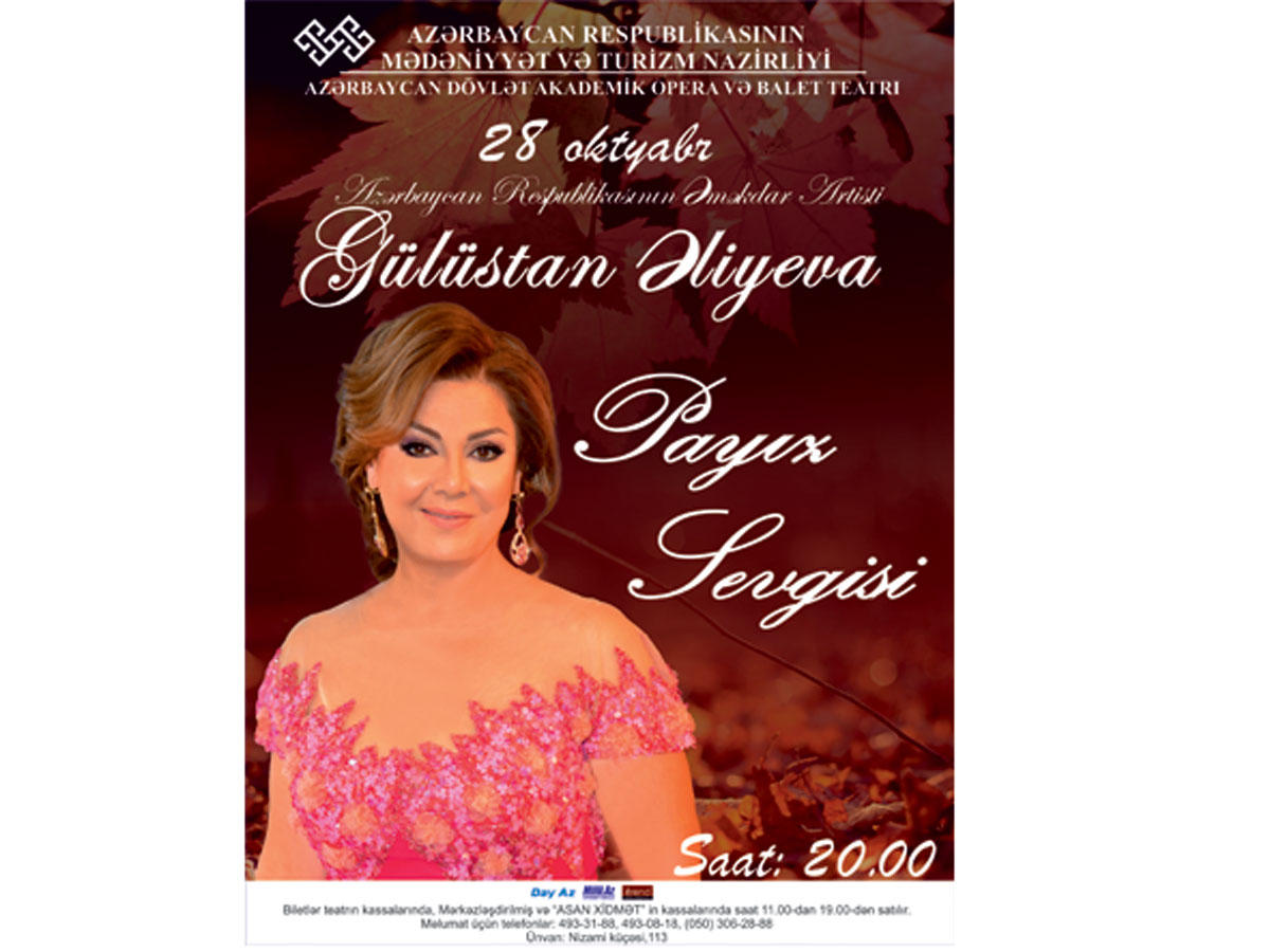БАКУ /Trend Life/ - Заслуженная артистка Азербайджана Гюлюстан Алиева выступит 28 октября с соло-концертом "Осенняя любовь" на сцене Государственного академического театра оперы и балета, сообщает Trend Life. Начало концерта в 20.00. Концерт организован при содействии министерства культуры и туризма Азербайджана.