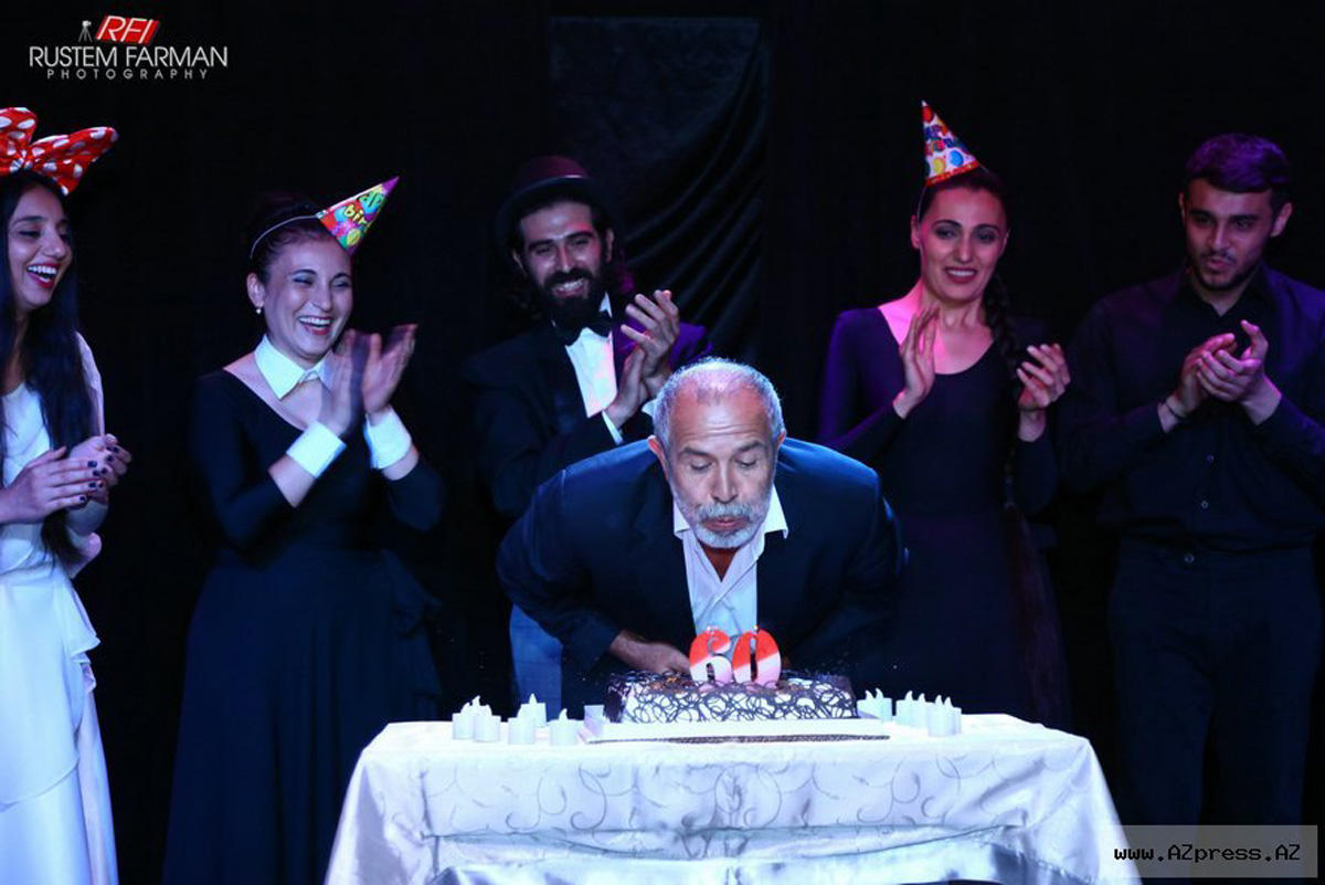 На вечере в честь юбиляра был представлен интересный спектакль "Qərib Teatr diyarında 60", преподнесен праздничный торт и цветы.