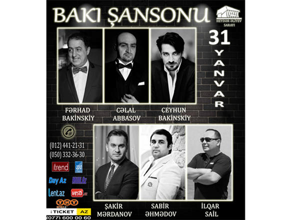 “Bakı Şansonu” (Бакинский шансон), сообщает Trend Life. На вечере выступят звезды бакинского шансона Ильгар Саиль, Джейхун Бакинский, Фархад Бакинский, Джалал Аббасов, Шакир Марданов и Сабир Ахмедов. Концертная программа будет представлена в театрализованной форме, с полюбившимися и новыми композициями.