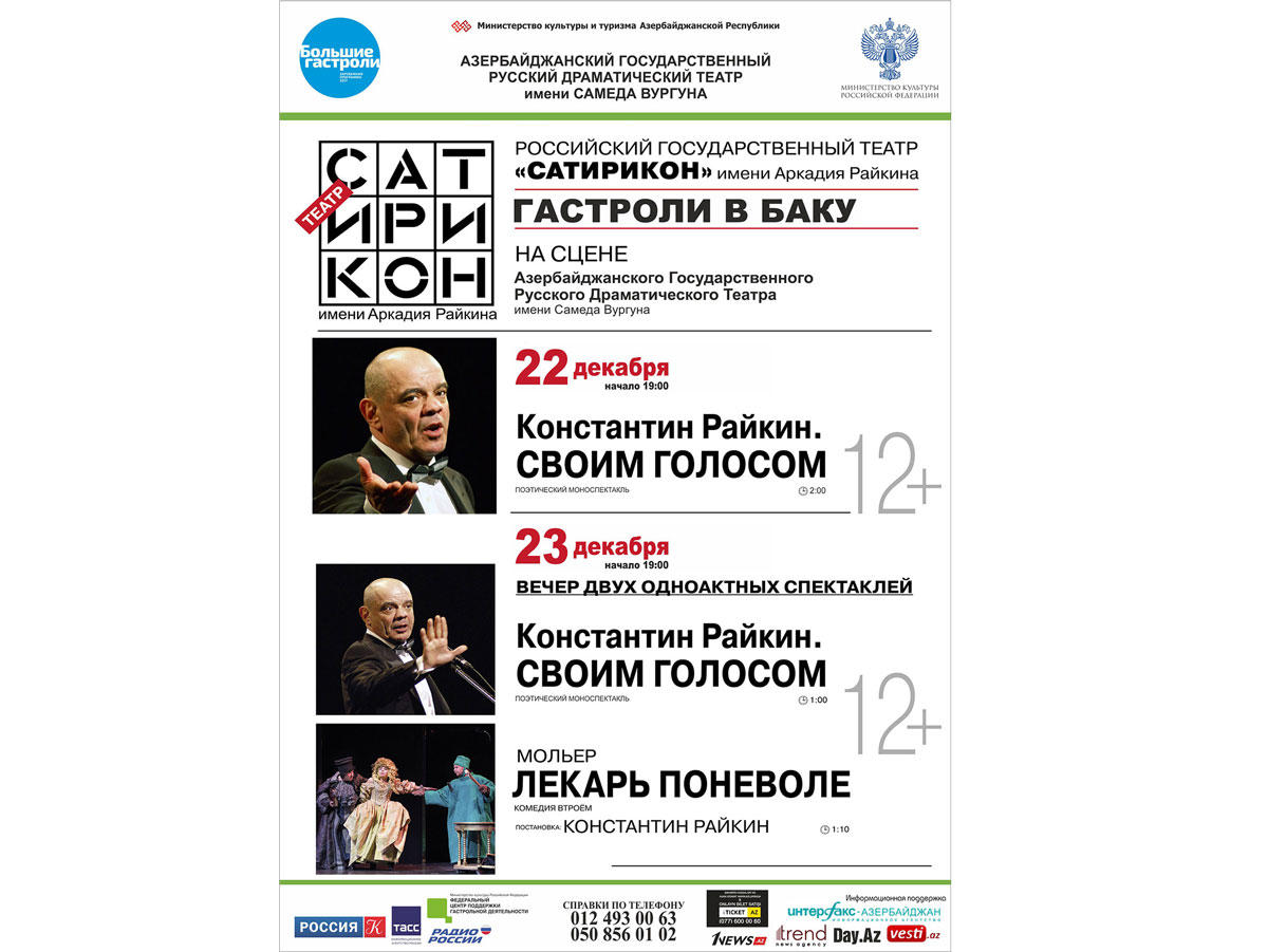 Как отмечают организаторы гастролей, сам Константин Райкин очень соскучился по Баку и с нетерпением ждёт встречи с городом и бакинским зрителем.