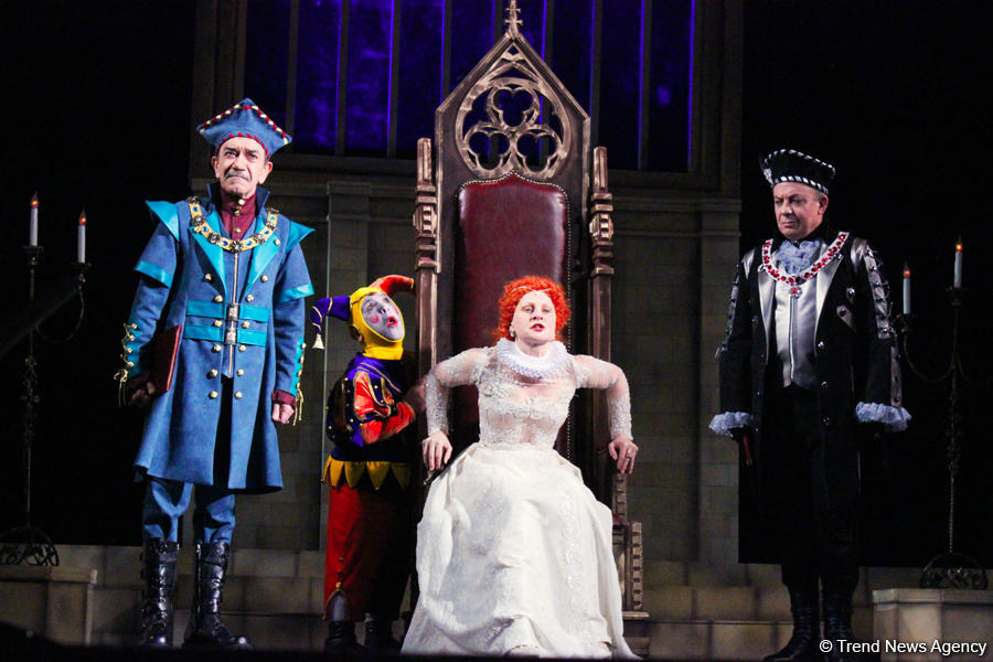 Персонажи спектакля - реальные лица английской истории, главная героиня – королева Елизавета (заслуженная артистка Наталья Шаровская), которая только взошла на престол, но сразу же окунулась в мир политических интриг, коварства, борьбы за власть…И везде маячит тень ее соперницы - Марии. Это рассказ о человеческих страстях, которые сплетаются вокруг Елизаветы - женщины сильной, волевой. И в то же время - юной, хрупкой и беззащитной, жаждущей любви. Эта линия становится главной в театральном решении режиссёра-постановщика, народного артиста Александра Шаровского, ведь недаром жанр пьесы - мелодрама. И королевы могут любить, и свои чувства она отдает лорду Лестеру (Мурад Мамедов). Однако, лорд Лестер женат на красавице Эйми Робсарт (Ольга Арсеньтева), и в то же время, отвечает чувствам королевы, что чревато смертной казнью за прелюбодеяние. Где взять силы, чтобы жить и любить, когда тебя атакуют заговорщики и лицемеры, когда ты не имеешь права любить сердцем и возлюбленного обязана выбирать в интересах Великой Державы, когда Испания грозит войной и дождь льёт непереставая?! А вокруг королевы – министр полиции и госсекретарь, коварный Френсис Уолсингем (народный артист Мабуд Магеррамов), которого называют «Ангелом смерти», и государственный канцлер Уильям Сесил (народный артист Сафа Мирзагасанов), простодушный и верный стране слуга. Трогательна в этой истории любовь немого шута (Надир Абдурагимбеков) к фрейлине королевы Анне (Милана Соколенко). Вокруг королевской персоны кипят нешуточные страсти! Кто же выйдет победителем в схватке сердца и разума? Персонажи этой истории - Джеймс Меррей (заслуженный артист Салман Байрамов), герцог Нортумберленд (Алексей Сапрыкин), посол Испании Кондоса (Ягуб Зейналов), епископ Эдинбургский (Заур Терегулов), капитан Блейк (Ибрагим Чингиз) помогают зрителям раскрыть дух того времени…