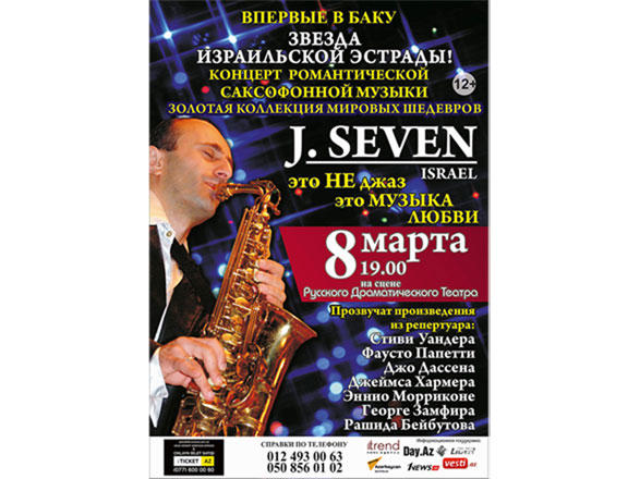 БАКУ /Trend Life/ - Впервые в Баку только 8 марта в 19:00 на сцене Азербайджанского государственного русского драматического театра имени Самеда Вургуна выступит звезда израильской эстрады J.Seven (Джей Севен) с концертом романтической, саксофонной музыки - золотой коллекцией мировых шедевров "Это не джаз, это музыка любви!".