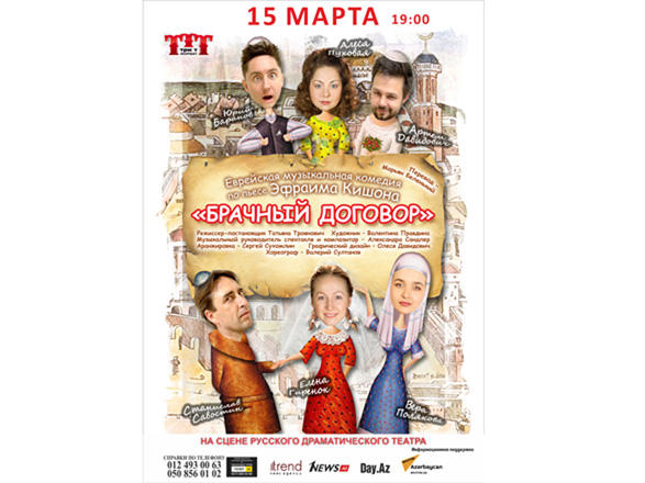 На сцене Азербайджанского государственного русского драматического театра имени Самеда Вургуна в 19.00 15 марта состоится показ музыкальной комедии "Брачный договор" по одноимённой пьесе лауреата Государственной премии Израиля, писателя, драматурга Эфраима Кишона. Комедию представят ведущие артисты белорусских театров, а также театрального проекта "ТриТформаТ".