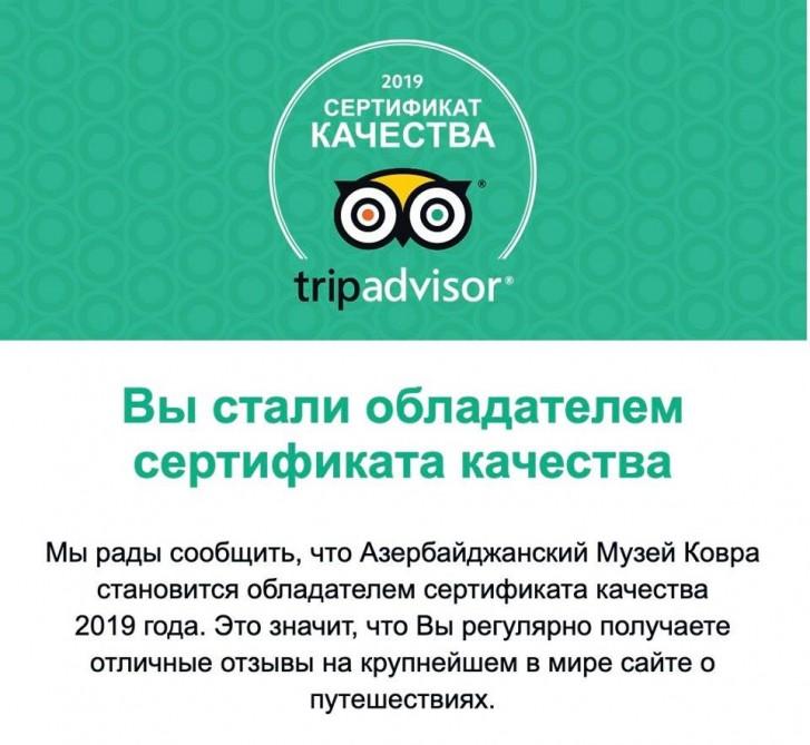 Отметим, что Азербайджанский музей ковра был удостоен такого сертификата в 2018 и 2017 годах. Это означает, что у Музея есть значительный шанс попасть в так называемый "Зал славы" TripAdvisor – почетный список, куда входят компании, удостоенные "Сертификата качества" этого сайта на протяжении пяти лет подряд.