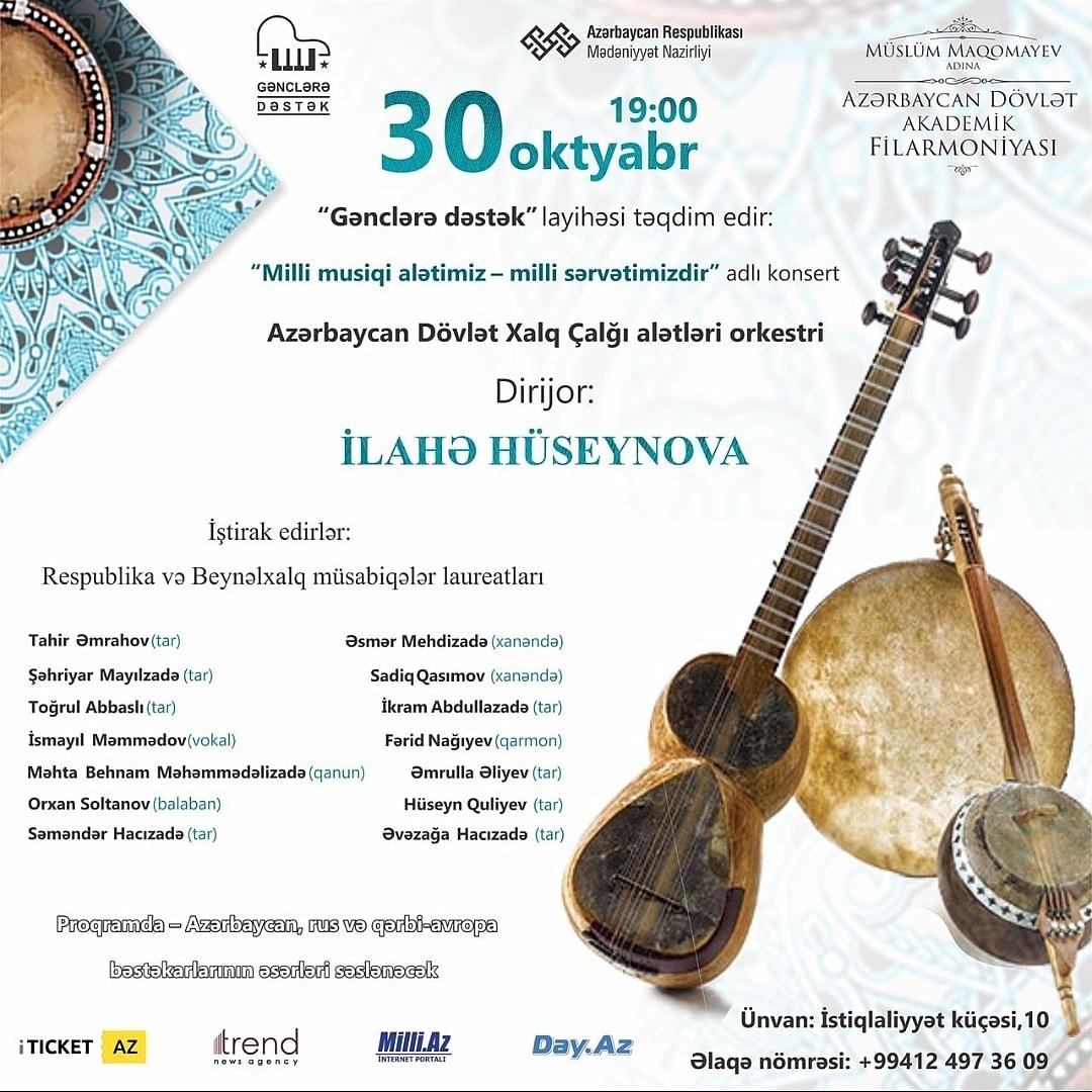 На концерте, который состоится под управлением дирижера Илахи Гусейновой, в рамках проекта "Gənclərə dəstək" (Поддержка молодежи), выступит Азербайджанский государственный оркестр народных инструментов (художественный руководитель и главный дирижер - народный артист Азербайджана Агаверди Пашаев). В программе примут участие лауреаты республиканских и международных конкурсов – исполнители на таре Тахир Амрахов, Шахрияр Маилзаде, Тогрул Аббаслы, Гусейн Гулиев, Амрулла Алиев, Икрам Абдуллазаде, Самандар Гаджизаде, Авазага Гаджизаде, гармонист Фарид Нагиев, исполнитель на каноне Бехнам Махта Мамедализаде, исполнитель на балабане Орхан Солтанов, ханенде Садиг Гасымов, Асмар Мехтизаде и вокалист Исмаил Маммадов.