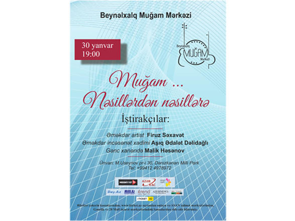 Первое мероприятие в рамках проекта будет представлено в 19.00 30 января. В этот день на сцене Международного центра мугама выступят заслуженный артист, известный ханенде Фируз Сахавет, заслуженный работник культуры, ашуг Адалят Делидаглы и молодой исполнитель мугама Малик Гасанов.