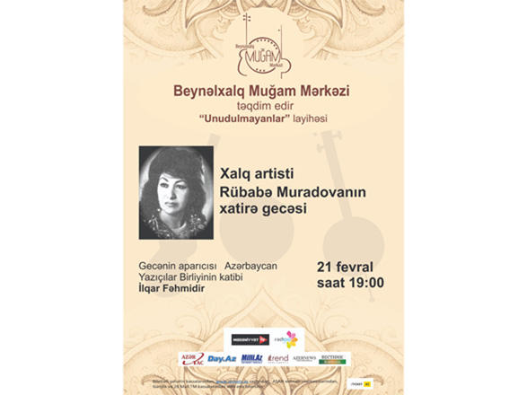 Вечер пройдет в рамках проекта Международного центра мугама – "Unudulmayanlar" ("Незабываемые"). На мероприятии будет рассказано о творческом пути исполнительницы, участники вечера поделятся воспоминаниями о незабываемой Лейли азербайджанской сцены, а также в исполнении молодых ханенде прозвучат произведения из репертуара Рубабы Мурадовой.
