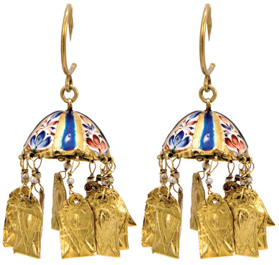 "Серьги являются самым распространенным украшением. Трехсоставные золотые серьги "дараги" были особенно популярны. Верхний ярус таких серег представлял собой розетку в форме цветка с семью лепестками и с цветным камнем в центре. К розетке крепились звенья, к которым подвешивали декоративный элемент. Эти серьги были подвешены с помощью двух колец, и таким образом форма украшения напоминала декоративный гребень. Отсюда и название серег - "дараги", то есть "подобные гребешку". Упрощенный вариант подобных серег представлен сережками "оймаги". Выполненные в технике эмали, они имеют форму полусферы, напоминающей наперсток (прим. - отсюда и название "оймаги" – "наперсток"), и украшены штампованными подвесками с изображением тюльпана.