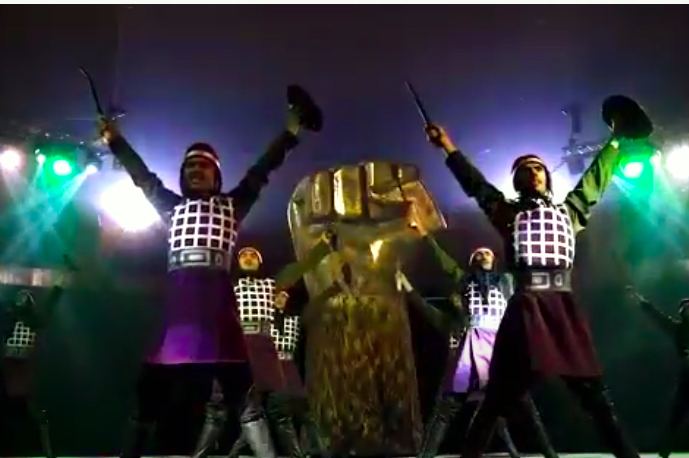 Актеры цирка в образе древних азербайджанских воинов с разящим мечом и щитом и героев Отечественной войны с горящими факелами символизируют историю нашей страны, с бесстрашием и доблестью готовыми разбить врага, который посягнет на родную землю. С гордостью и честью до конца стоять во имя Отчизны!