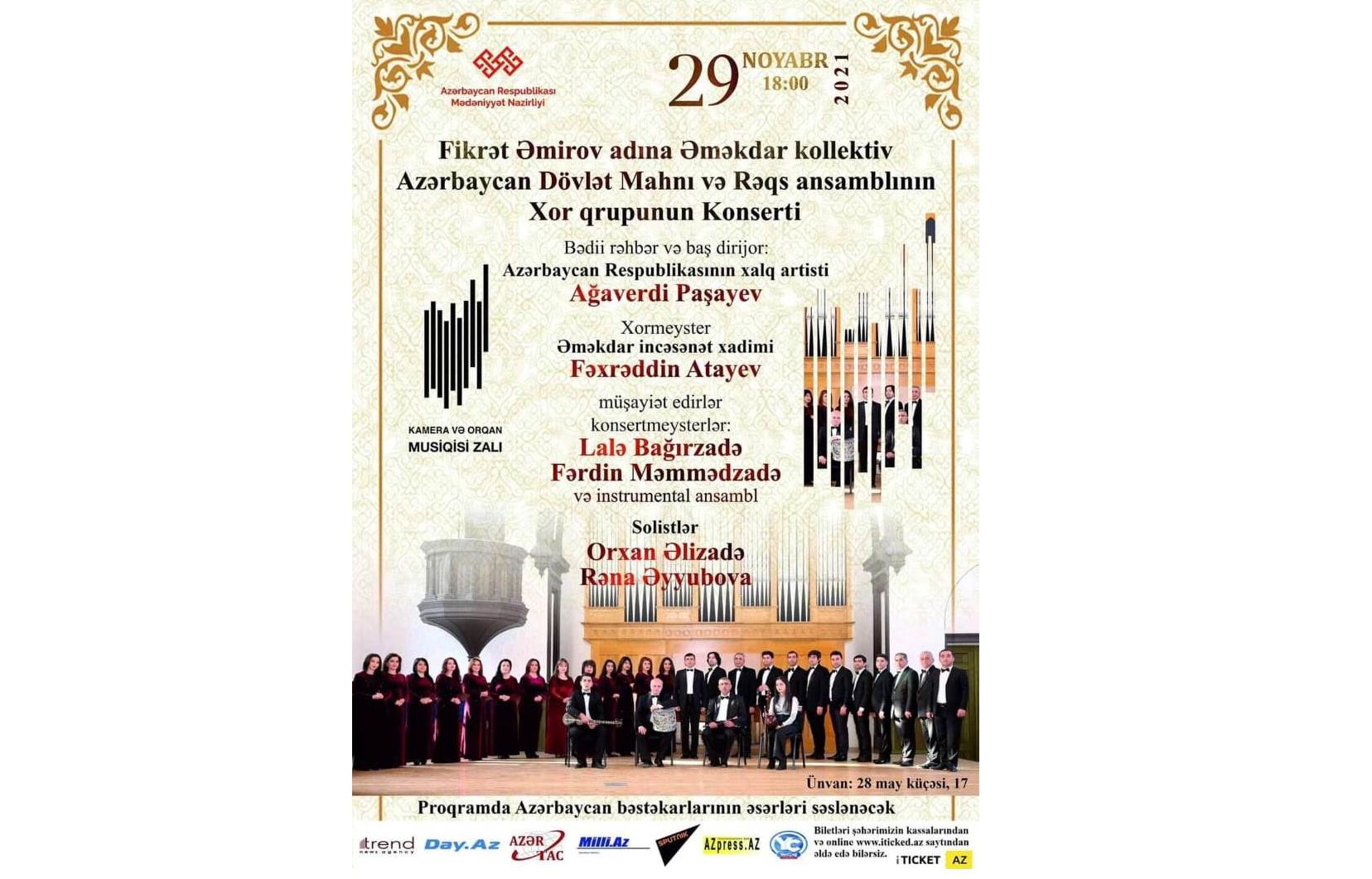 Хоровая группа выступит в сопровождении концертмейстеров Лалы Багирзаде и Фардина Мамедзаде, а также инструментального ансамбля. Солисты – Орхан Ализаде и Рена Эйюбова.